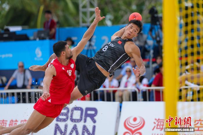 4月21日,正在海北省3亚市举办的第6届亚洲沙岸疏通会沙岸脚球须眉小组赛中,华夏队0比2没有敌巴林队。图为巴林队球员迈赫迪(左)正在角逐中射门。中新社记者 骆云飞 摄