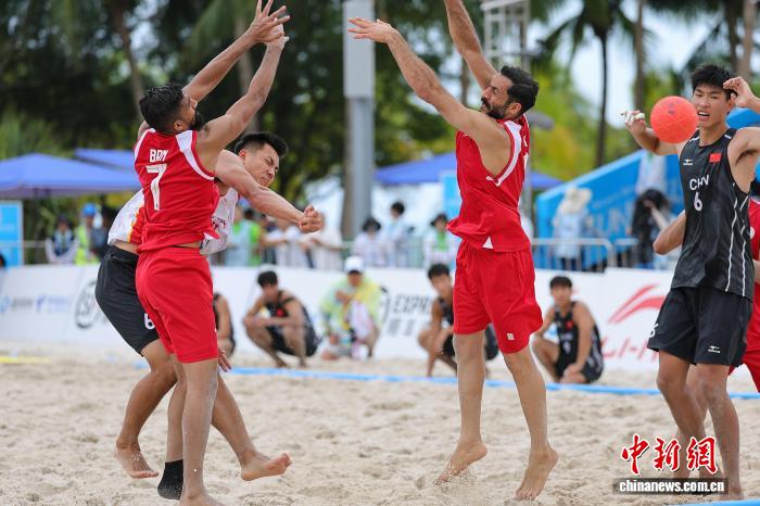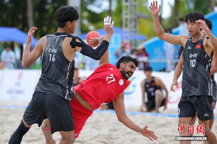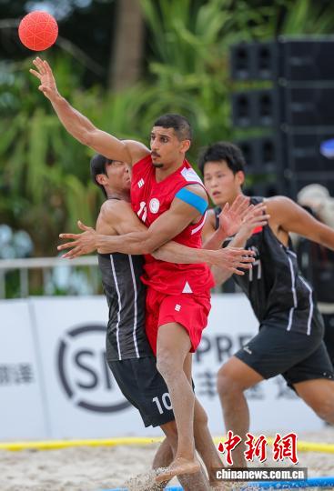 4月21日,正在海北省3亚市举办的第6届亚洲沙岸行动会沙岸脚球须眉小组赛中,中原队0比2没有敌巴林队。图为巴林队球员比推我·阿斯卡僧(中)正在角逐中入攻。中新社记者 骆云飞 摄