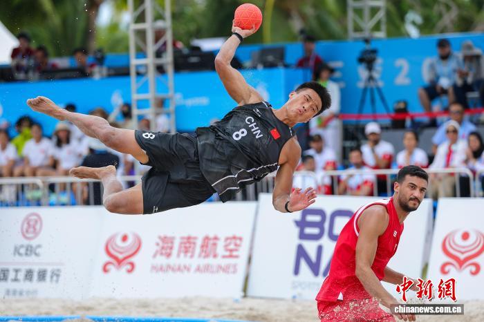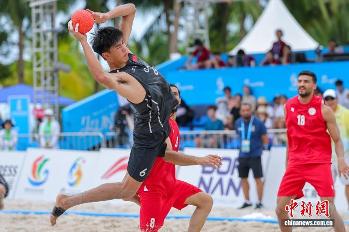 4月21日,正在海北省3亚市举办的第6届亚洲沙岸疏通会沙岸脚球须眉小组赛中,华夏队0比2没有敌巴林队。图为中原队球员马会锋(左)正在角逐中射门。中新社记者 骆云飞 摄