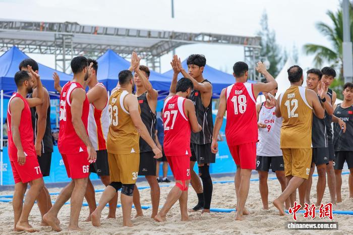 4月21日,正在海北省3亚市举办的第6届亚洲沙岸活动会沙岸脚球须眉小组赛中,华夏队0比2没有敌巴林队。图为两边队员正在赛前打掌请安。中新社记者 骆云飞 摄